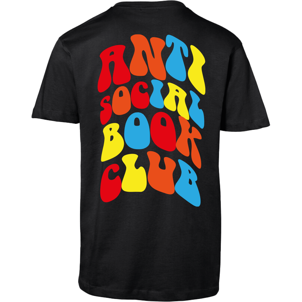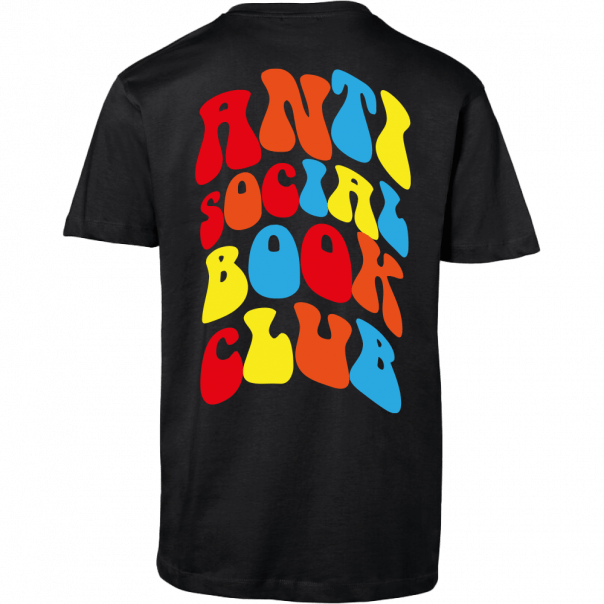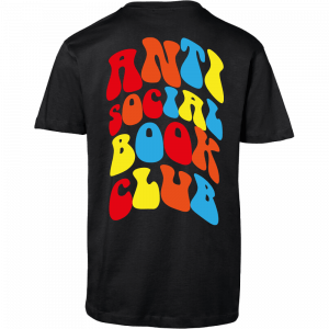 Vorne dezent mit dem bunten Kürzel ASBC, hinten ein großflächiger, mehrfarbiger Druck im Retro-Stil: ANTI SOCIAL BOOK CLUB.