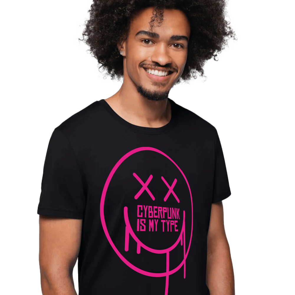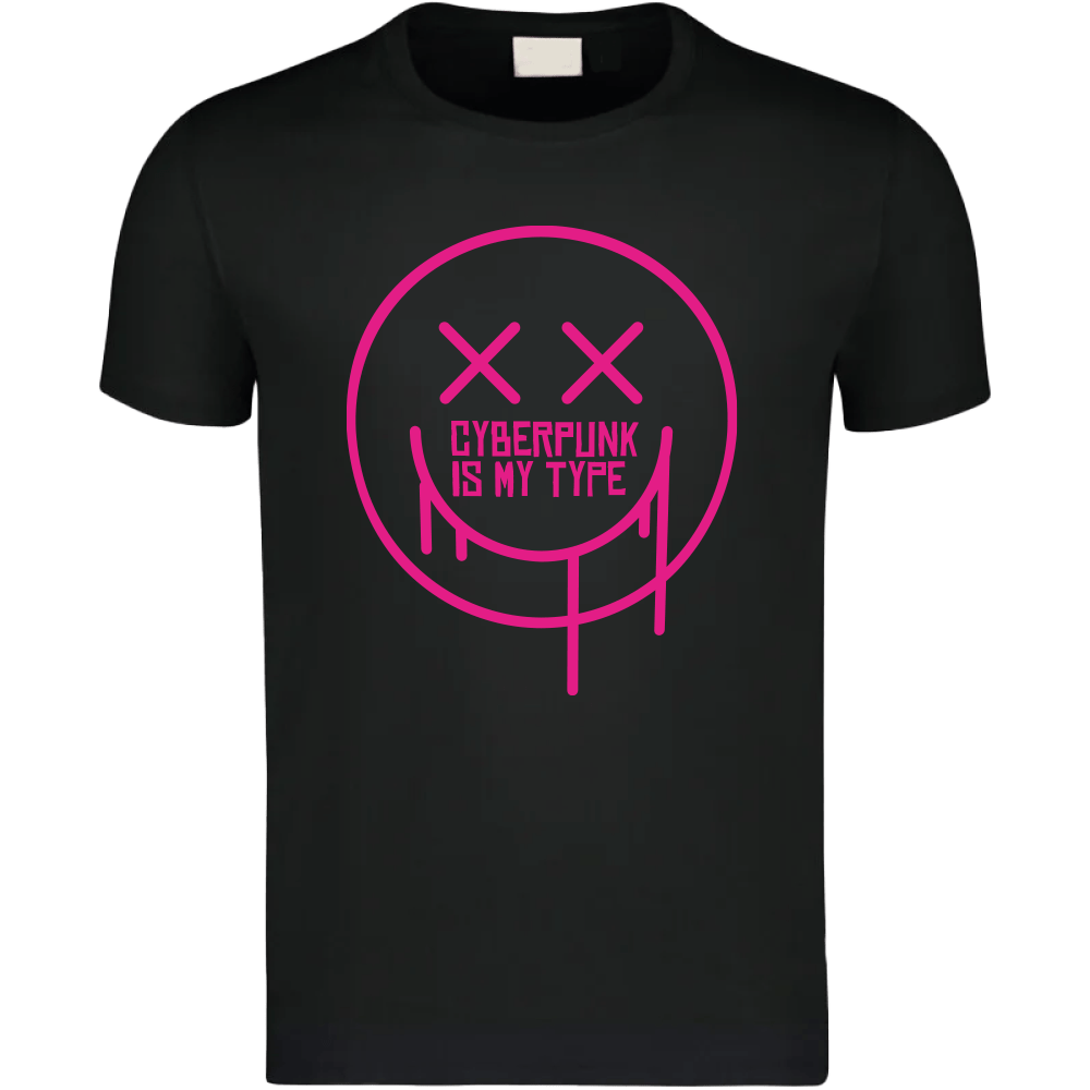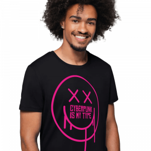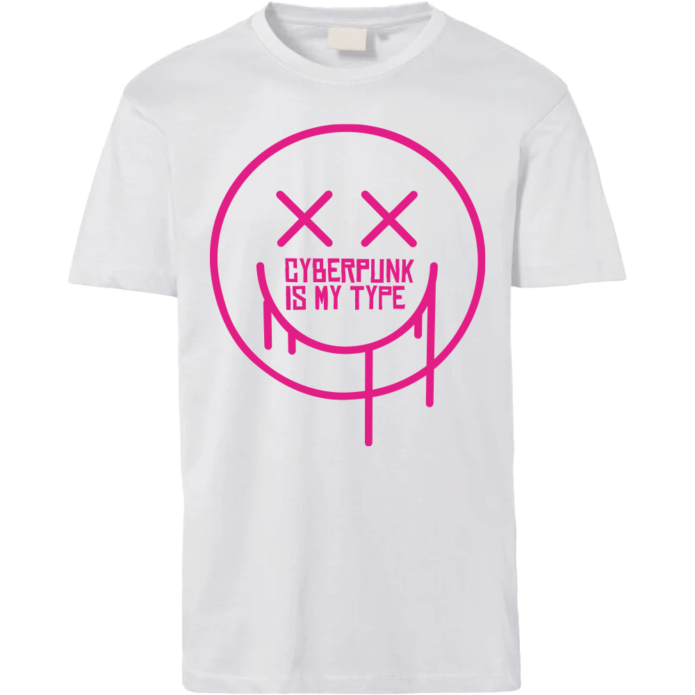 Mach dein Outfit zum Statement! Dieses stylische T-Shirt überzeugt mit dem auffälligen Frontprint: Ein großes Smiley-Motiv im Cyberpunk-Style mit dem Schriftzug „CYBERPUNK IS MY TYPE“.